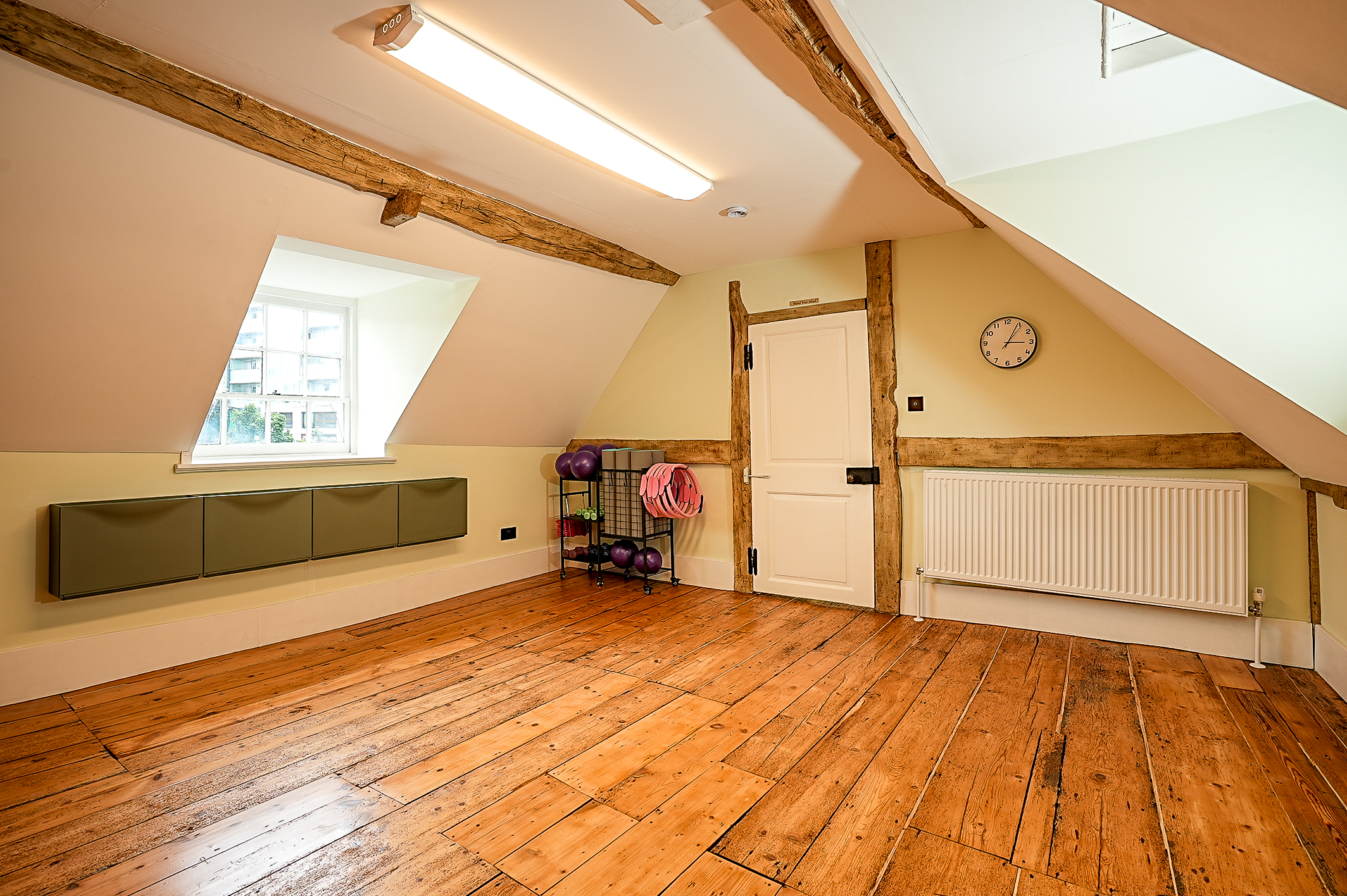 A larger studio fully equipped portable ballet barres and mats. This room also comes with a variety of small Pilates equipment and light hand weights.